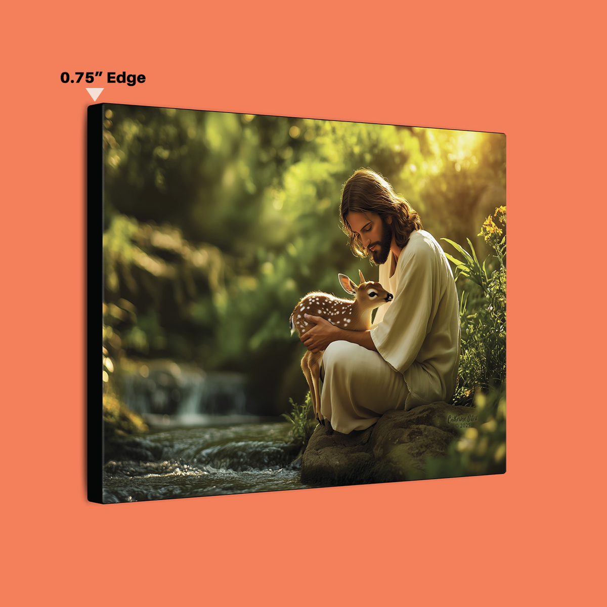 Bring a touch of serenity and gentle joy to your home with this heartfelt ‘Joyful Silence’ canvas. Featuring a serene image of Jesus tenderly holding a baby deer, this artwork captures the beauty of His love, compassion, and connection with His creation. Perfect for living spaces, a baby nursery, prayer rooms, or as a heartfelt Christian gift.