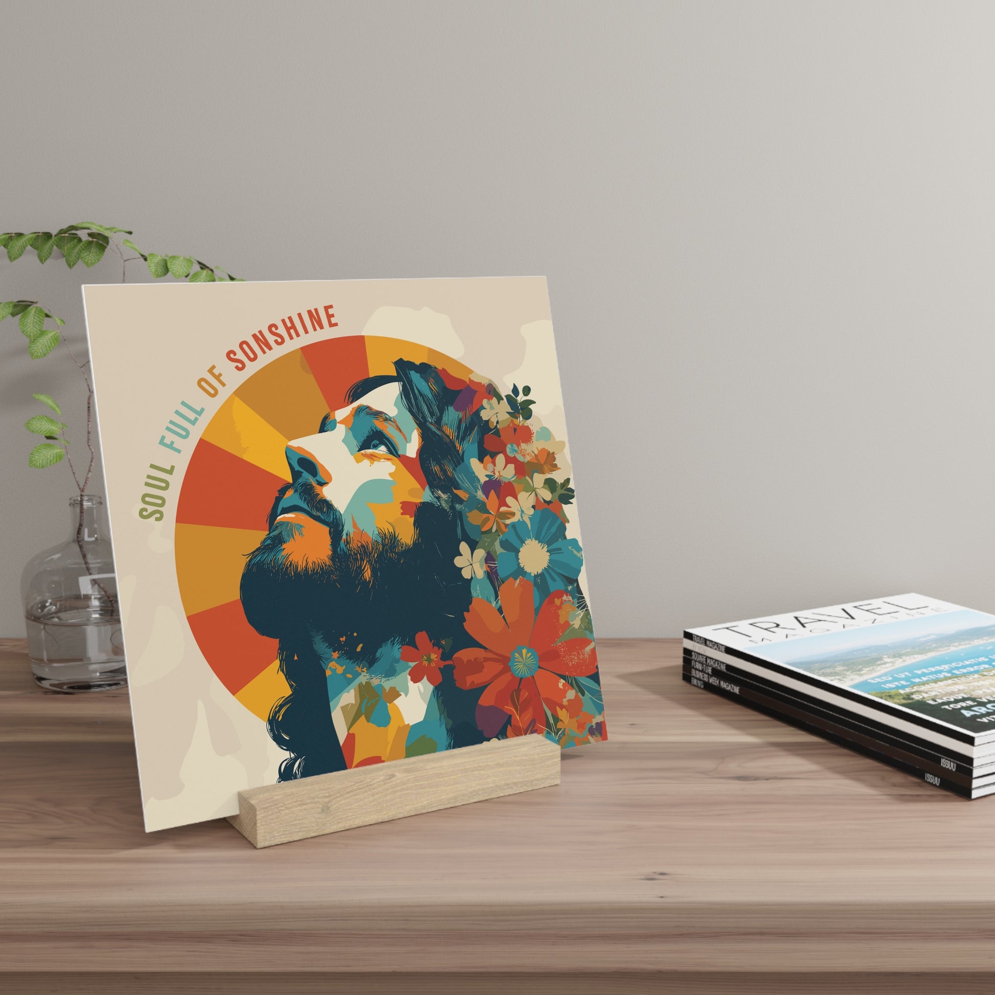 Retro-style Jesus, glowing sunrays, and vibrant colors—bring a little Sonshine- not only to your soul but also your desk, shelf or to any space! Hand-crafted, solid oak display included.